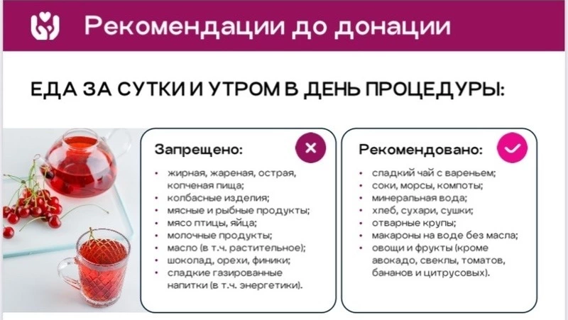 Медики напоминают, что стать донором может любой здоровый человек старше 18 лет и весом не менее 50 кг. За сутки перед донацией рекомендуют придерживаться специальной диеты, а после процедуры уделить внимание восстановлению организма.